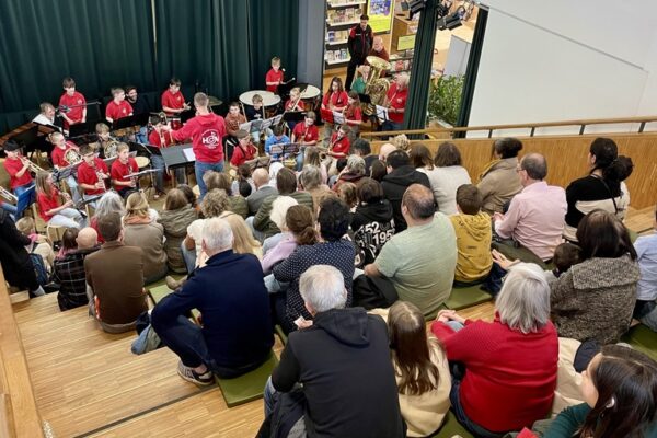 Al snel klonken er vrolijke klanken en dat trok nieuwsgierige bezoekers. Kinderen, ouders en grootouders namen plaats op de traptribune, luisterden aandachtig en lieten zich meevoeren door het enthousiasme van de jonge muzikanten. En wie dat wil, kon ook meedoen met het optreden op een zelf meegenomen instrument of op de boomwhackers van HOV.