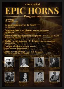 Die avond, om 20:00 uur, brengen hoornist en dirigent Erik Rozendom en zijn Soldaat van Oranje-collega, pianist Michiel Ballhaus, een meeslepende recital. Daarnaast laat Maria Antonia Riezu ons kennismaken met de bijzondere klanken van de natuurhoorn, spelen hoornweekend-deelnemers Wilma Dorst en Astrid Verbeek een betoverend duet op de alpenhoorn, en verzorgt hoornist, gitarist en singer-songwriter Allard Robert samen met enkele deelnemers een speciale uitvoering van ‘I’ve Got the Horn’.
